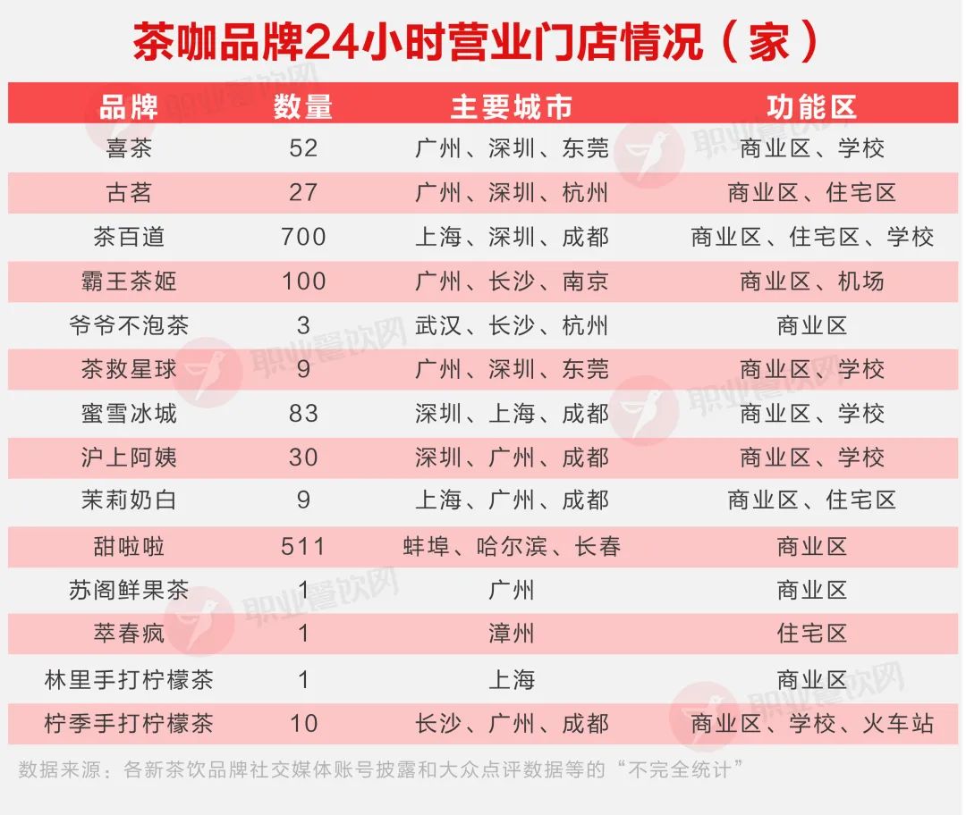 据相关平台数据显示,业内至少有20个茶咖品牌涉足24小时营业门店,如茶百道、古茶、上海阿姨、书烧仙草、茉莉花奶白等新茶品牌。,并且还在扩大规模。