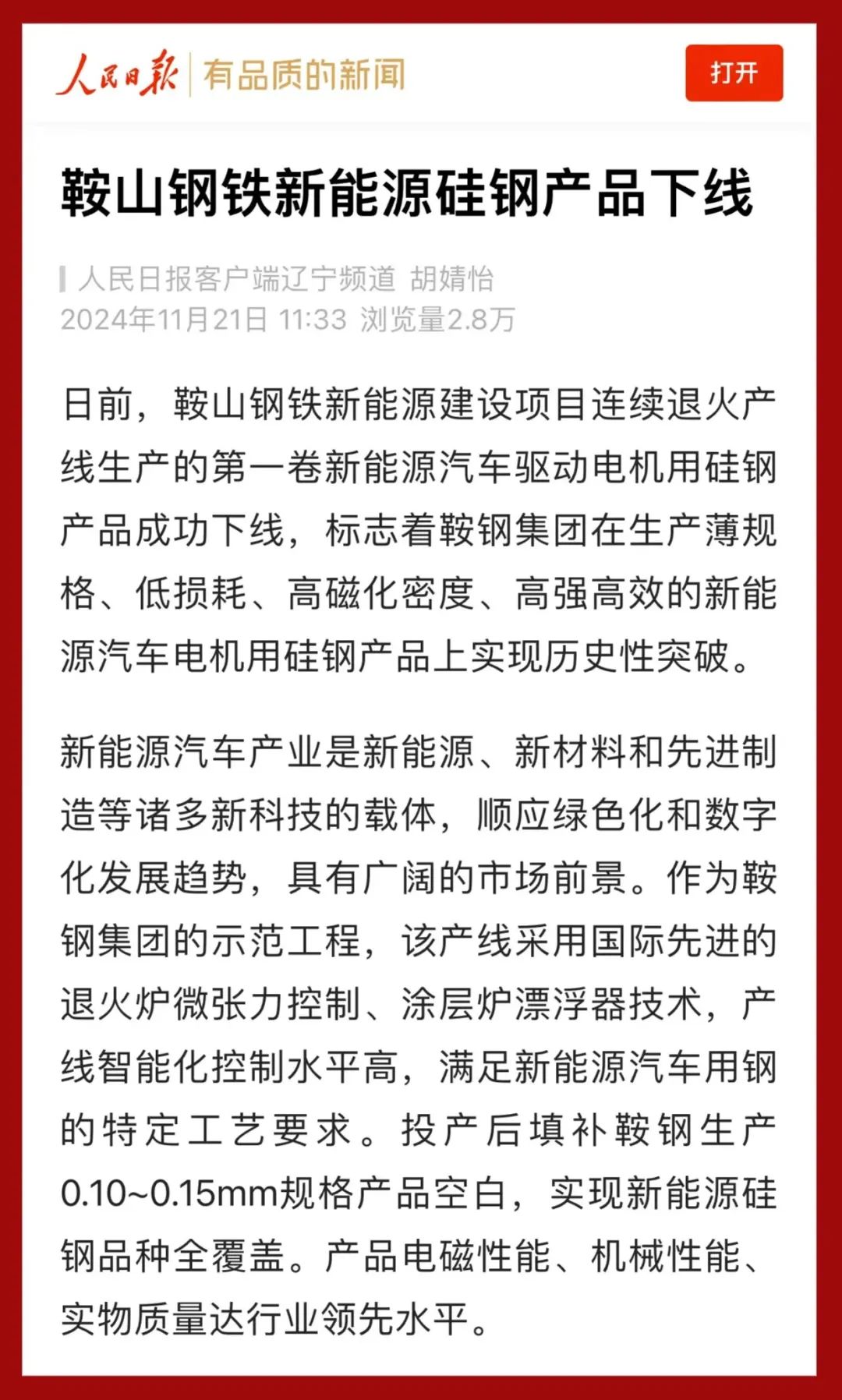 原标题:“央媒看鞍山人民日报客户端:鞍山钢铁新能源硅钢产品下线”
