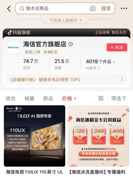2020年,海信开始以尝试的态度布局抖音电商,发现抖音用户的消费能力出乎意料。因为在传统的货架电商平台上,支持销售的主要电视产品通常是55英寸、65英寸等低价产品。但是在抖音电商中,通过直播和短视频内容筛选出进店的用户,对产品配置的要求更高。大型、高价商品,75寸甚至85寸,成为主要销售类别。