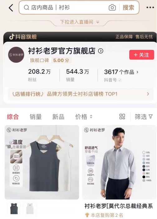 许多服装品牌与“衬衣老罗”走出了类似的道路,在抖音电商的货架上进行了深度布局,推动了整体成交量的增长。