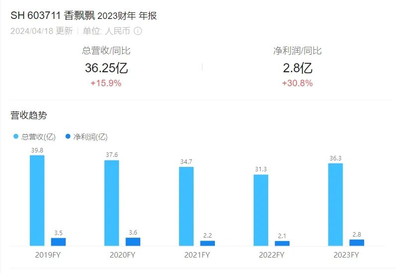 从2020年开始,香飘飘营收趋势由上升转为下降,而且速度一度接近10%,净利润也在2021年开始下降,最大幅度达到37.90%。直到2023年,这两个指标才再次回到上升状态,但从未回到2019年的巅峰水平。