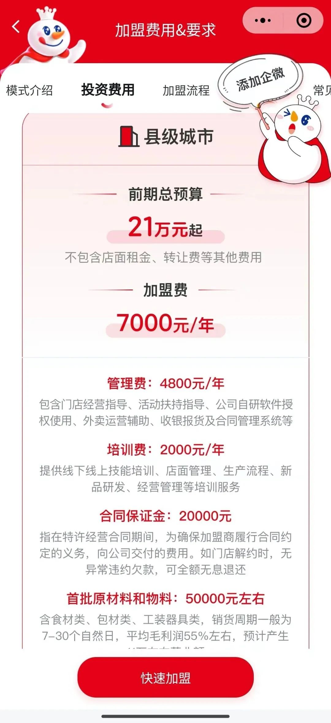 相比之下,在加盟领域,加盟蜜雪冰城,即使在县级城市,前期总预算也会高达21万元,去掉租金、人工、转让费等费用;加入霸王茶姬,去掉租金、人工、转让费等费用,前期总预算在80万元以上。