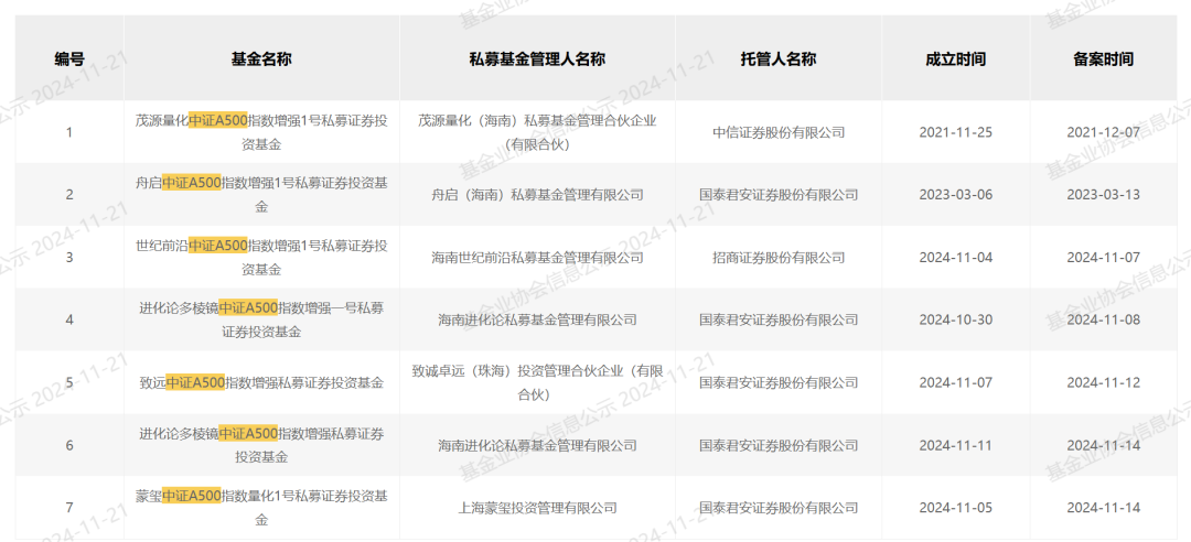截至目前,基金行业协会已有7个名称,包括中国证券交易所A500私募指增商品备案,包括进化论、世纪前沿、茂源量化、致诚卓远、蒙玺等头部量化经理,其中进化论已备案2个产品。