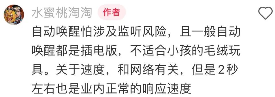 火山文化创意经理在下面回复:自动觉醒怕涉及监控风险,自动觉醒一般是插电版,不适合孩子的毛绒玩具,响应速度与网络有关。