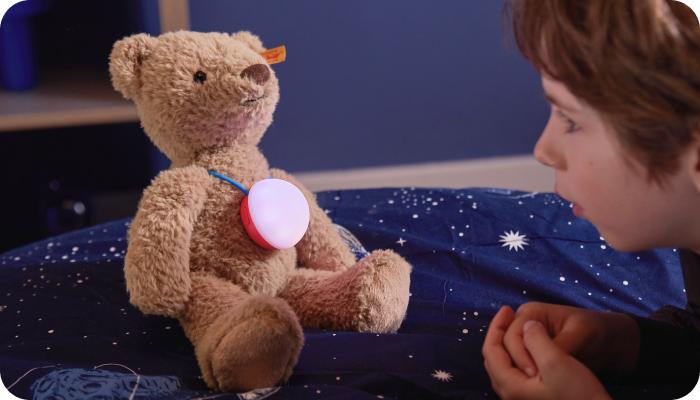 它由硅胶制成,看起来像一个小灯泡,可以挂在各种毛绒玩具上。