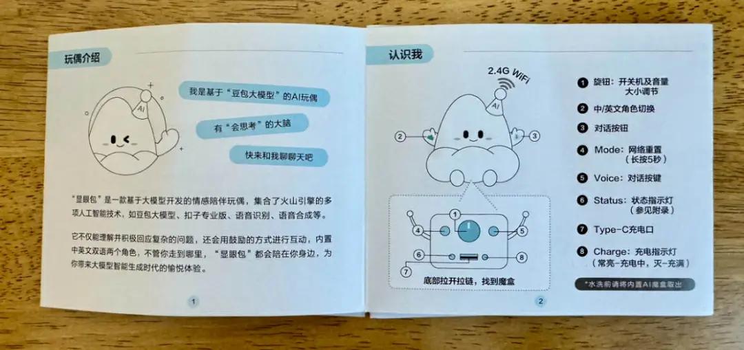 这个 AI 魔盒配备了豆包大模型和标准版纽扣的能力,嵌入娃娃底部。客户旋转按钮并连接到网络后,可以与显眼的包进行对话。