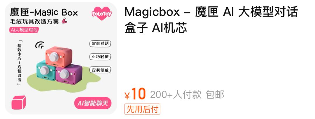 它旗下的 Magicbox - 魔盒,是一个集成的 AI 智能对话盒,体积小,便于安装在任何玩具上。