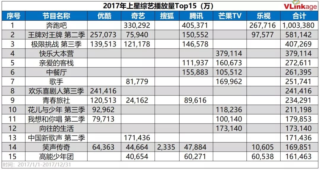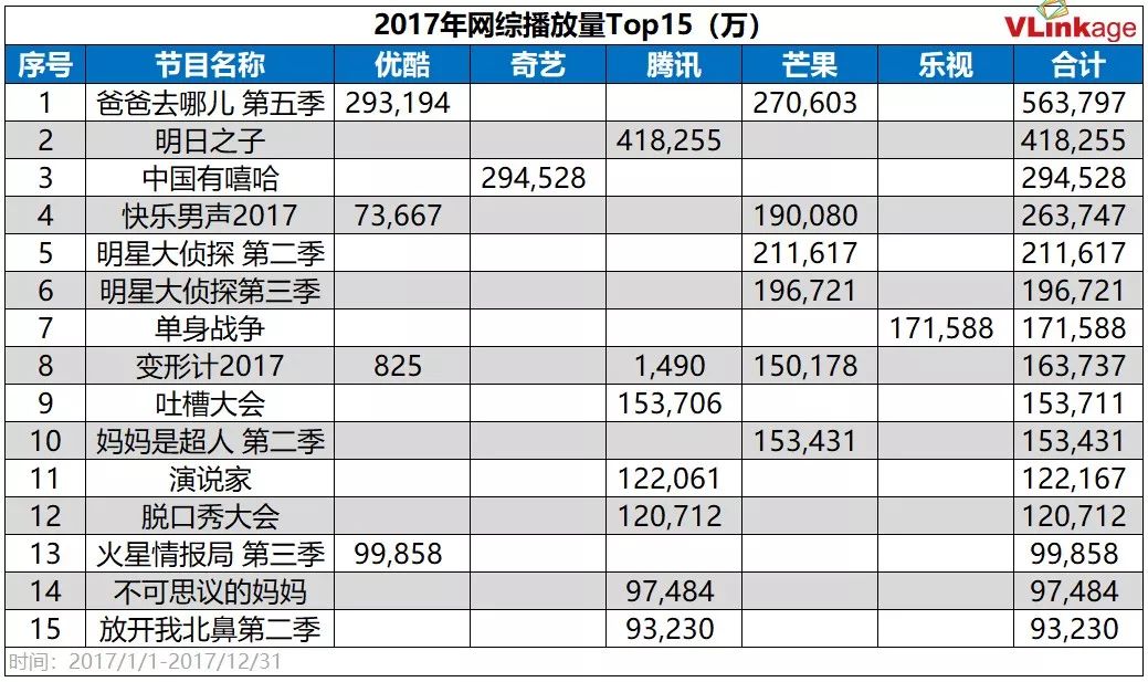 2017年,视频平台崛起,大量资金进入, 电视台和视频平台的话语权转换,尤其是在综艺市场,非常网络综艺平台的播放量已经超过了电视王牌综艺节目。 ,据V榜数据显示,网络综艺在2017年单平台播放量最高的五个综艺节目中占据了三席。
