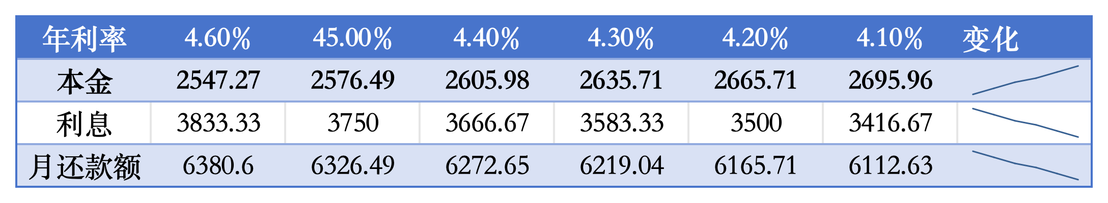 首先是资本部分,因为贷款执行利率降低,重新计算的还款金额每个月都会发生变化,第一笔资本的还款速度会加快,调整后第一笔还款本金会增加。据了解,这与等额本息还款方式的特点有关,即在利率不变的前提下,随着还款日数的增加,每月还款总额保持不变,但成本增加,利息减少。