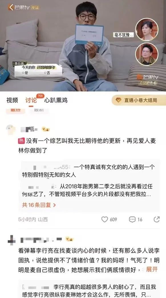 第六期上线当天,关于芒果电视最新节目的讨论已经超过1000个。“没有一个综艺节目让我期待他的更新。再见,爱人麦林,你做到了。“麦琳需要心理引导,否则会在全网引起负面评价。她自己处理不了这种性格和思维能力。因为她不理解,没有人在镜头外指导她,她看不到镜子里的自己有多需要正视自己的问题。很明显,观众的目光仍然集中在李行亮和麦琳身上。