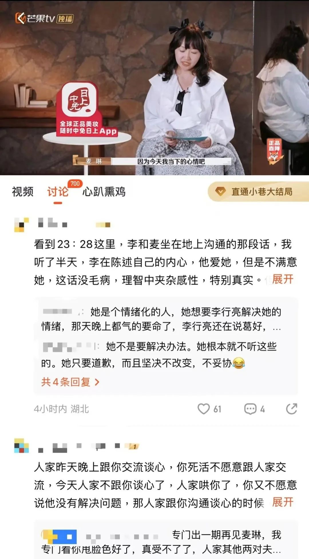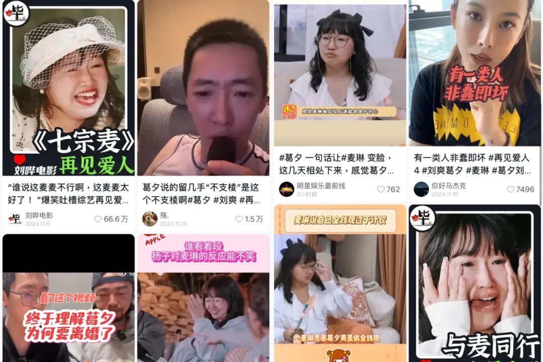 因此,娱乐价值官会在小红书、抖音、Aautorapper、哔哩哔哩击中评价麦琳和李行亮婚姻问题的博主。这两位嘉宾不经意间为互联网提供了足够的创作素材。然后,反馈他们的当然是流量的财富。