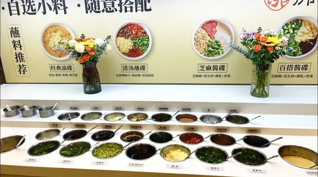 其中,调料台提供28种食材,不收费。顾客可以选择自己的调料。店里专门贴了四种吃法:经典油菜、清汤蘸菜、芝麻酱菜、好酱菜。