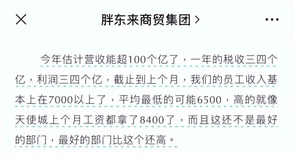 这个世界太无稽之谈了。他们什么也没说?他们不敢说什么?胖东来治疗!一个打扫卫生的阿姨,在庞东打扫卫生,一个月能拿到6000元。一个基层服务员可以在胖东来一个月拿到7000元。胖东来不仅给了足够的钱,还给每个员工买了社保。在胖东来混个中产阶级,年薪可以二三十万,做好一些可以四五十万。