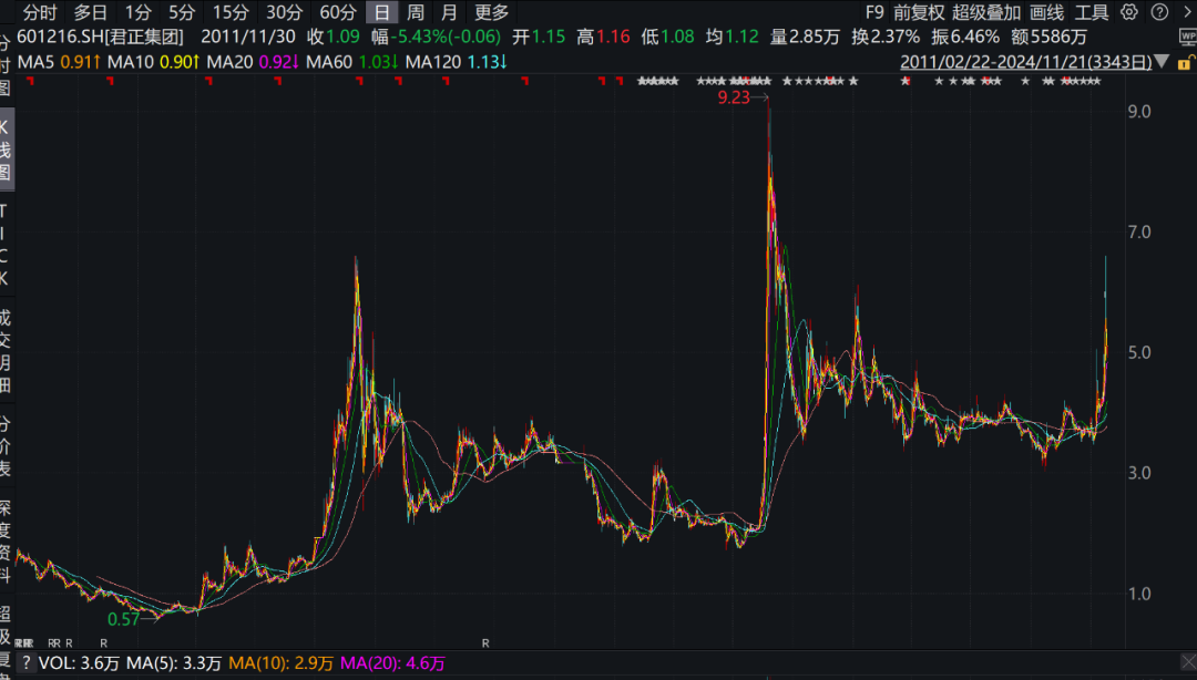 最近,君正集团的股价正处于第三个高峰期。特别是十一月六日至十一月十二日期间的五个交易日,也获得了三个涨停。
