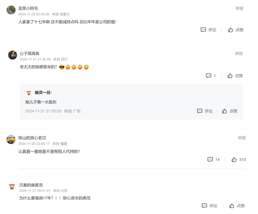 田秀英出生于1946年,现年78岁,拥有郑钧集团近17年的股权。“78岁的老太太创造了a股创造财富的神话”的讨论在网上迅速发酵。有些网民表示,“耐心资本的典范”、"不是普通的老太太"、"这钱孙子都花不完"。然而,也有网友质疑“是否代持”。、田秀英与实际控制人有关系吗?