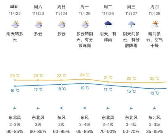 十一月二十二日,阴天转阴;气温16-23℃;东北风2-3级,相对湿度60%-85%。我们城市的降雨趋于结束,未来几天天况也将好转,干燥需要抓紧未来三天!