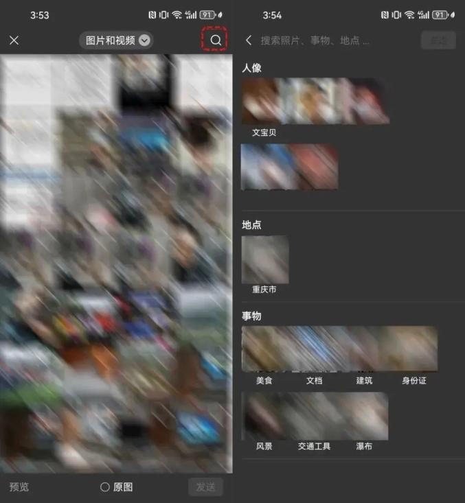 新版本中,当Android用户在聊天中向朋友发送图片时,页面右上方增加了一个“放大镜”搜索按钮。