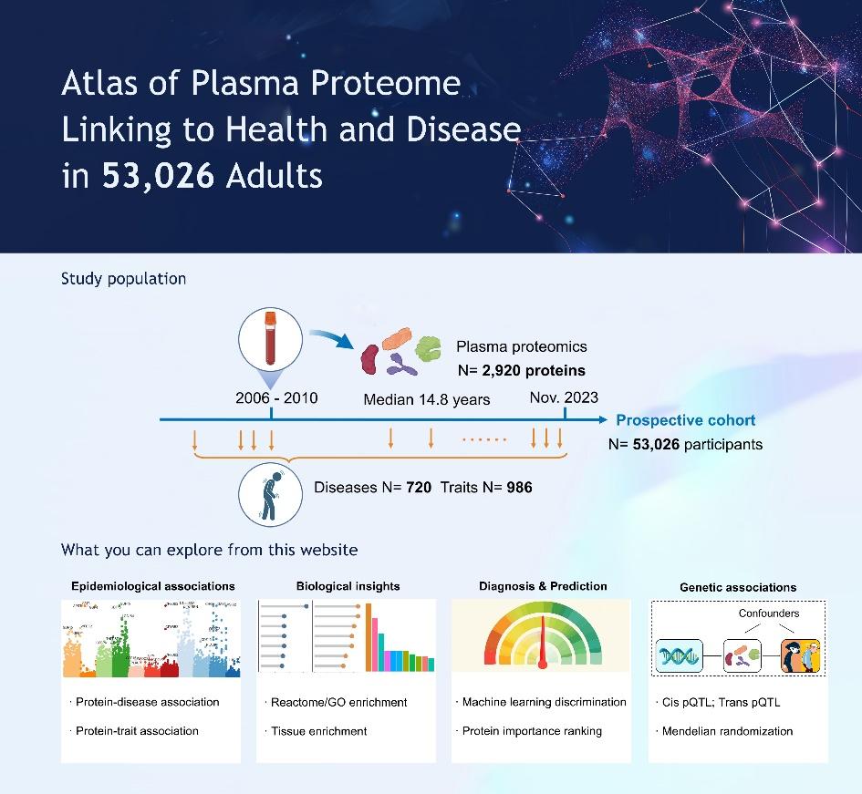 通过对53,026个人血液蛋白组数据的深入分析,该研究跨越了14.8年中位随诊期,建立了全面的蛋白组图谱。这个图表包括2,920种血液蛋白,406种以前的疾病,660种随诊新病,986种健康相关表型,揭示了168,100种蛋白-疾病的关联,554,488种蛋白-表型的关联。研究发现,超过650种蛋白质与至少50种疾病有关,超过1000种蛋白质表现出性别和年龄的异质。这些发现加深了我们对疾病共享和特定分子机制的认识,揭示了不同人群在疾病易感性方面的差异,为精确诊断和治疗提供了科学论证。