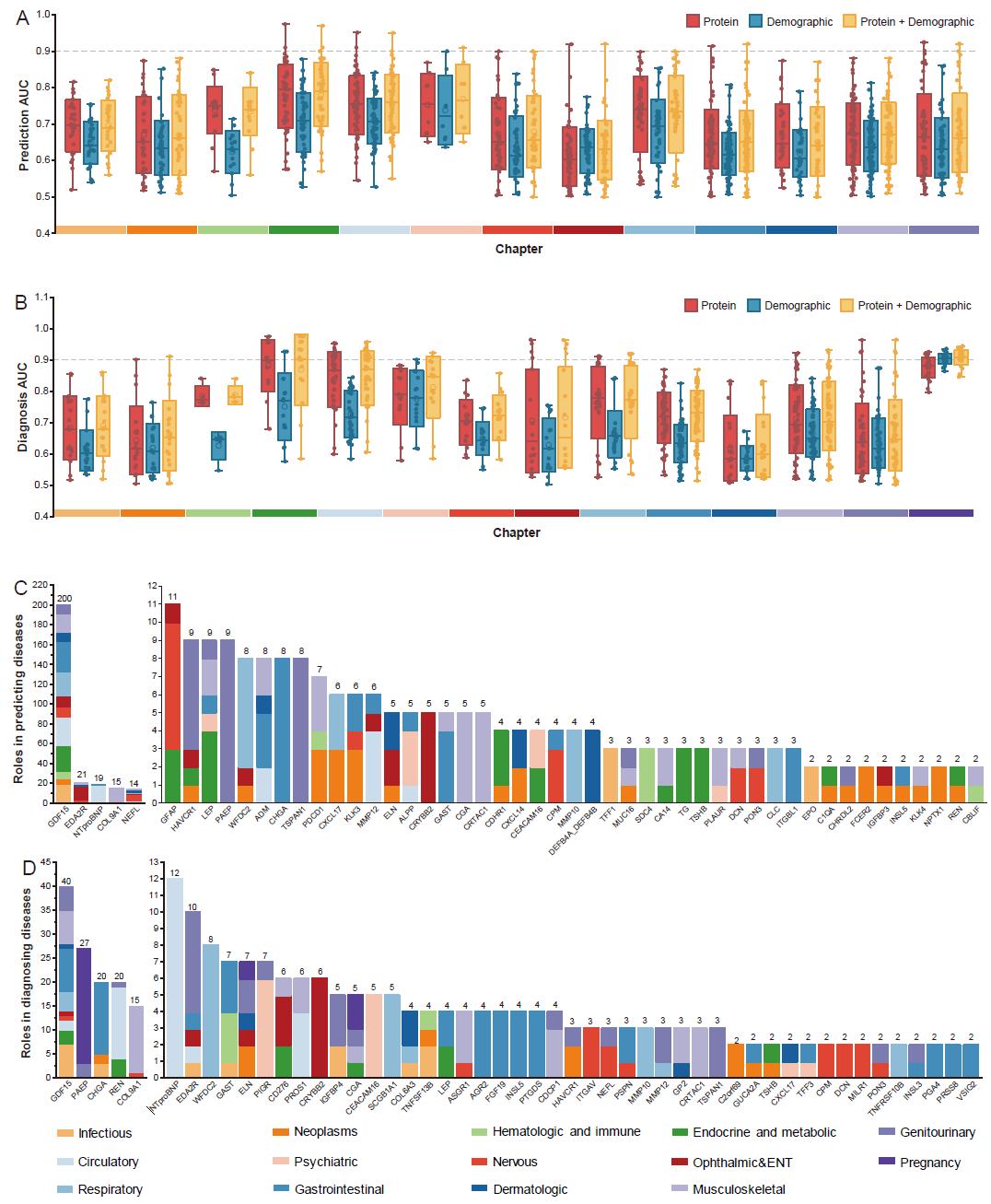 在疾病预测和诊断中,蛋白质的性能(A-B.血浆蛋白、人口统计和综合模型预测[A]和诊断[B]疾病的AUC值;C-D.疾病预测中的蛋白质[C]和诊断[D]关键度排序)