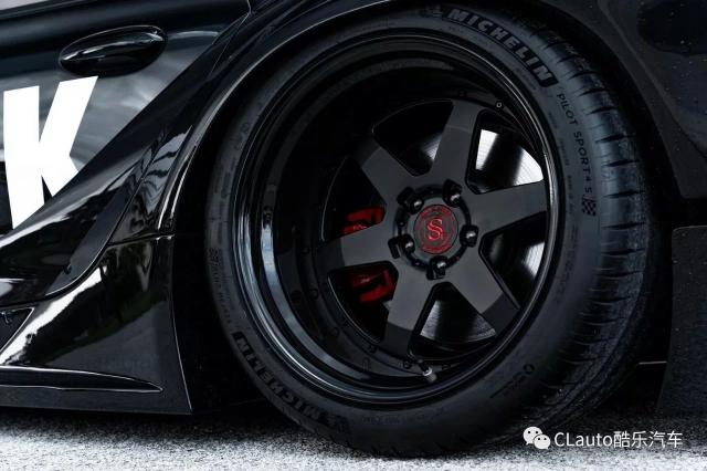 在车头部分,车辆采用了全新的前尾和空气力学风刀,并按照 Liberty Walk 经典造型,汽车前胎拱也被扩大,露出标准铆钉,车侧还配有一对延长式运动侧裙。
