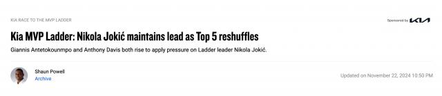 NBA官方MVP排行榜:约基奇重返前三名。 库杜詹携手进入前十