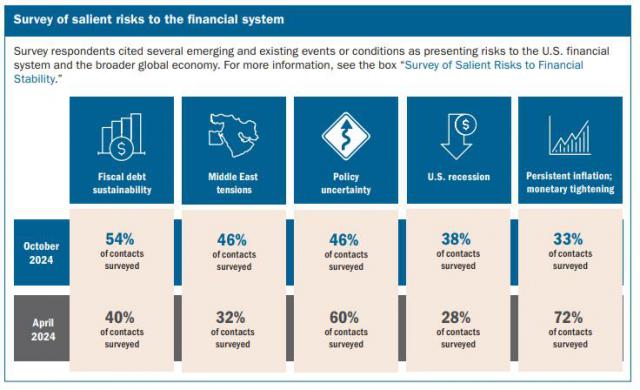 美联储调查显示,在美国大选到来之前,近几个月金融专业人士对美国通货膨胀的焦虑明显减少,认为通货膨胀对金融稳定的威胁不如全球贸易战。与此同时,他们对美国联邦政府巨额债务的焦虑明显加剧,债务的可持续性被视为头号金融稳定风险。