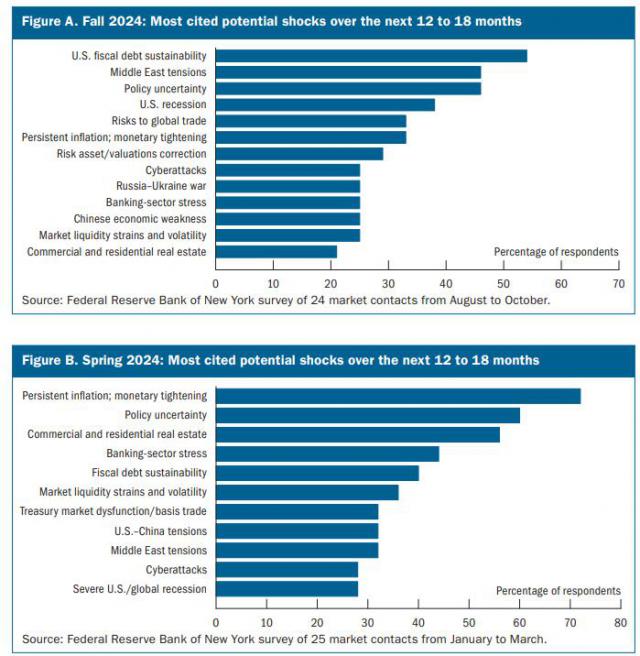 “对美国财政负债可持续性的担忧被(受访者)提及最多的风险。调查指出,在经济低迷阶段,增加国债发行可能会开始挤出私人投资或限制应对的政策措施。”