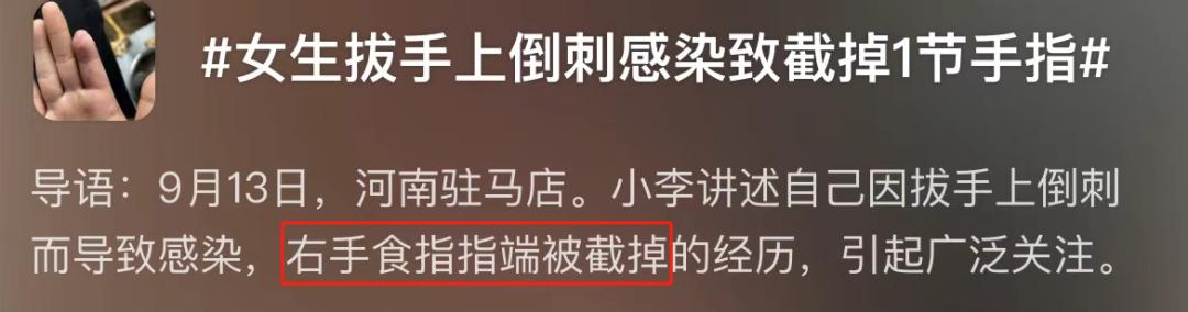 今年 9 月 13 当天,河南的小李因为拔出手指上的倒刺而发红,于是向医生求助。然而,就诊后,感染仍未得到控制。此外,她患有糖尿病,这是一种遗传因素,伤口很难修复。经过半个多月的多次转院治疗,最终只能通过手术切掉一根手指来保住整只手。