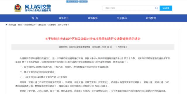 深圳交警发布通知,自行 2024 年 11 月 25 日起,我市部分地区和道路上的货车将继续实施限量交通管理措施。