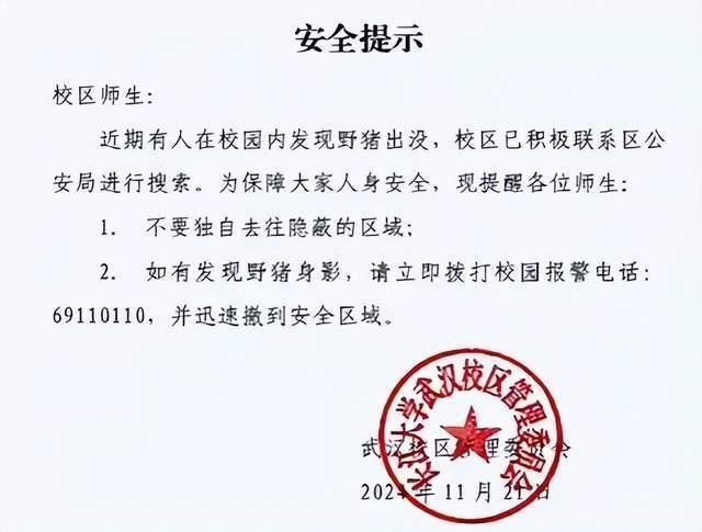 11 月 22 日本,记者联系了长江大学武汉校区。工作人员向记者确认了视频中的信息,并表示此次事件并未造成人员伤害,但涉案山猪仍未被抓获。”“昨天凌晨很快 1 点,我们保卫部发布通知,说,公安局找了几只狗搜,最后围到湖边,把山猪逼到湖里游走。”