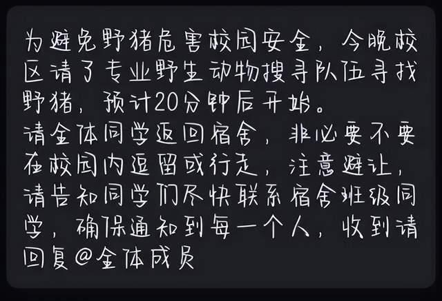 发布者在评论区表示,21 当天晚上,学校呼吁专业的野生动物搜索团队寻找山猪,要求学生尽量不要留在学校。