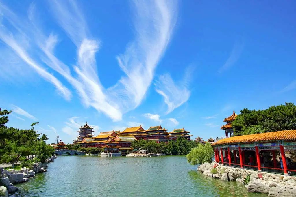 蓬莱八仙过海景区东靠近三仙山景区,北靠长山列岛。它是一个以仙海文化为主题,以八仙故事为背景的海上花园。景区三面环海,形状像一个躺在海上的宝葫芦。周围的水域天高水阔,美不胜收。