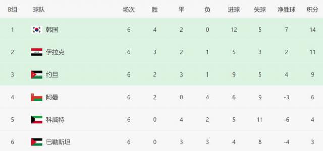 在韩国爆冷失分之后,也收到了一个好消息,那就是争二对手之一的约旦同样爆冷失分,1-1 被科威逼平,让韩国领先小组第三的优势不断保持下去。 5 分数优势,打入 12 球且仅丢 5 球,6 轮积 14 分力压力伊拉克领先积分榜。