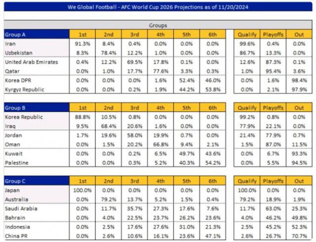 根据名字预测网站 We Global Football 根据预测分析,日本直接进入世界杯的可能性高达 另外,韩国的概率是100%,没有悬念, 99.2%、伊朗的概率 三支球队都超过了99.6%。 99%,距离出线只有时间问题。