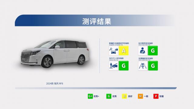 回到中国保险研究院的碰撞测试,除了车外行人安全分指数和耐撞性和维修经济性分指数外,瑞风 RF8 分别获得 G(出色)和 A除了好评之外,在客户最关心的车内乘客安全分指数上,瑞风 RF8 驾驶员侧面正面 25% 偏差撞击,乘客侧正面 25% 偏差冲击,正面 50% 偏差冲击,车顶强度测试,座椅 / 头枕及保险带提示均可获得 G(优秀)评价,包括侧面撞击下的驾驶员,后排乘客的头部保护,以及车身结构都成功通过了测试。