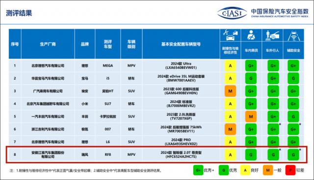 而且不久前,基于 2024 年中保险研究公布的第一批车辆碰撞结果,我们真的发现有两款车型。 MPV,理想 MEGA 和瑞风 RF8 大家在实验中都取得了领先同行的出色冲击成绩。