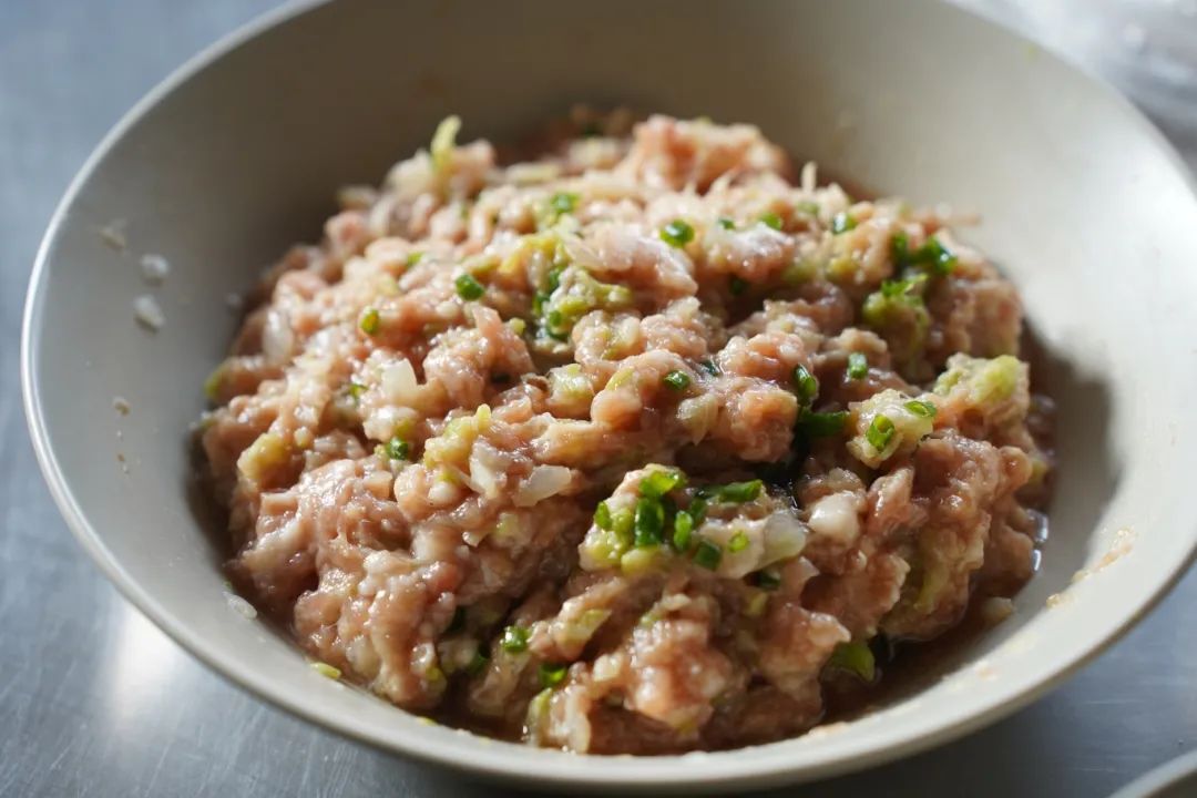 馅料:将猪肉末放入盆中,加入盐、味精、糖、葱、姜水,顺时针搅拌均匀,然后加入生粉继续搅拌,或加入冬笋等蔬菜,搅拌均匀。