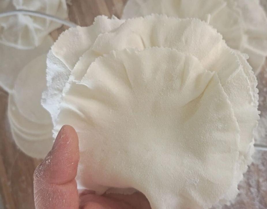 制作面团:将醒面好的面团搓成长条,分成15克左右的小剂子,擀成薄薄的面团,边缘擀出荷叶边。