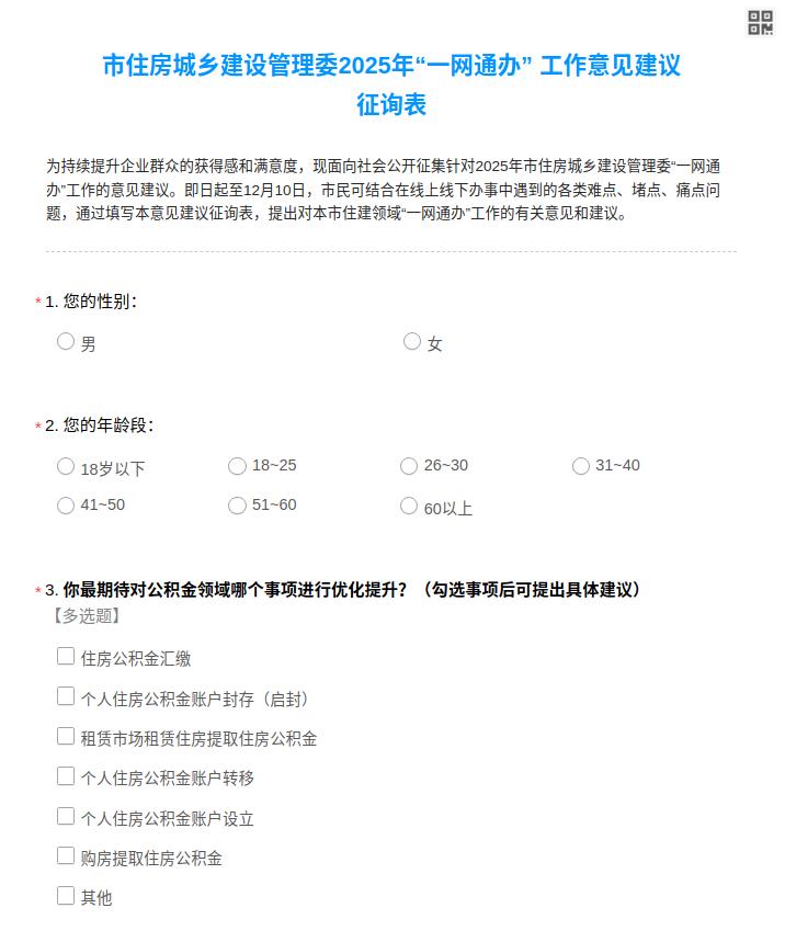 据市住房和城乡建设委员会介绍,为了不断提高公司群众的获得感和满意度,我们现在正在为社会公开征集关于2025年市住房和城乡建设委员会“一网通办”工作的意见和建议。即日起至12月10日,市民可通过填写本意见和建议表,对当地住房和城乡建设领域的“一网通办”工作提出相关意见和建议。详细↓