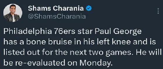 费城官方宣布:由于左膝骨挫伤,乔治将在下周重新评估两场比赛。