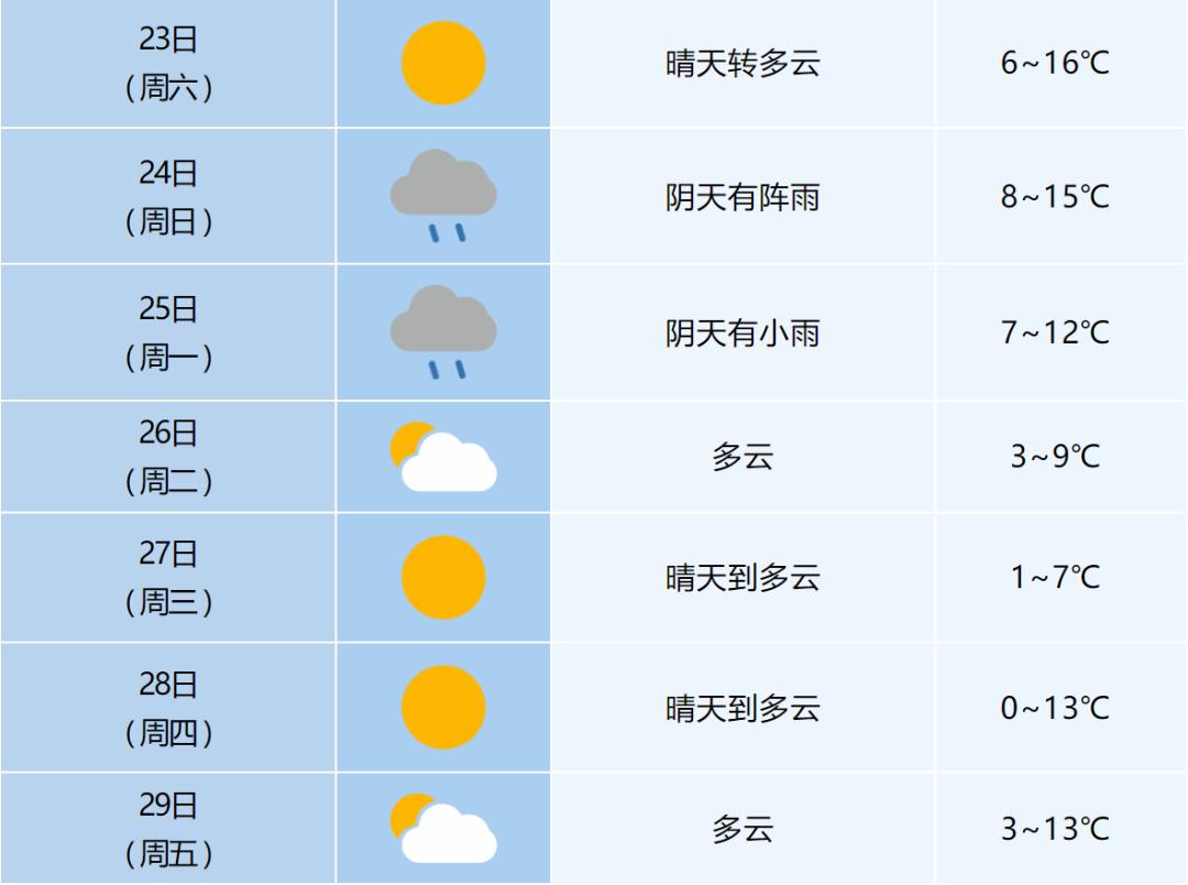 23日(周六):全省多云转阴天,江淮南部部分地区和江南部部分地区有小雨。