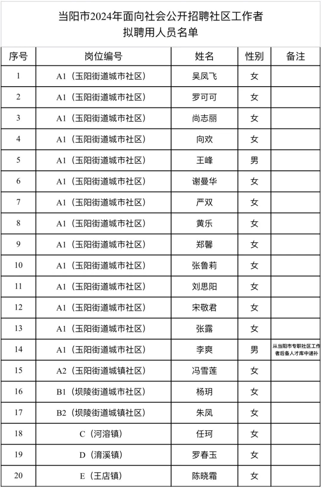 根据《当阳市2024年社区工作者公开招聘公告》的要求,拟录用20名社区工作者,经报名、资格审查、笔试、面试、体检、考察等程序公示。