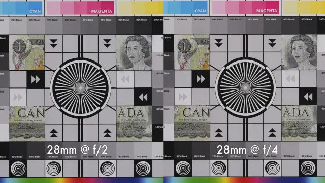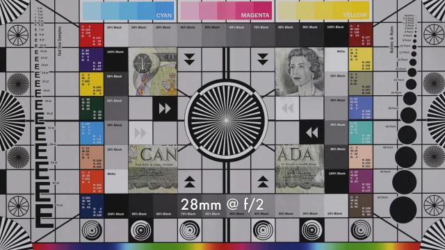 回到实验室看看它的分辨率测试, 28mm 端光圈全开时,中心分辨率相当好,对比度也相对较高。