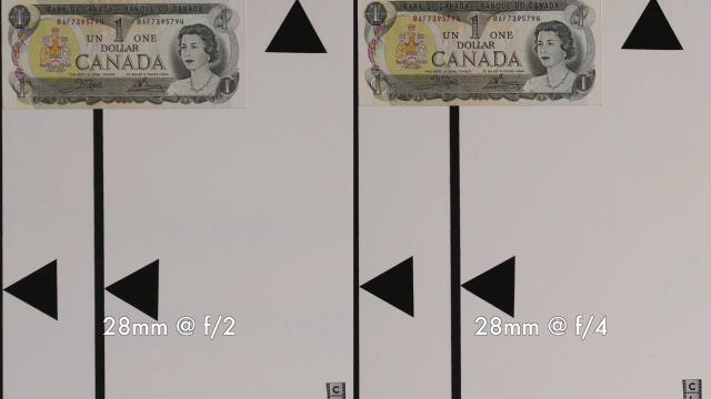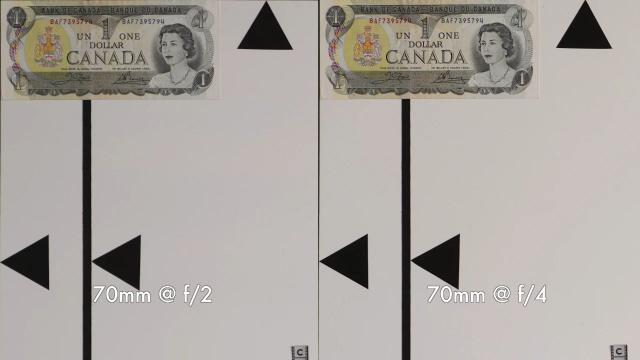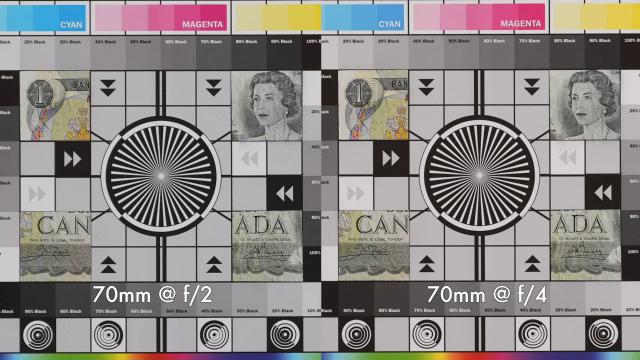70mm 端中心状态和 28mm 端类似,全开的时候可以得到相当不错的分辨率表现,甚至收缩光圈到 F4 改善也不明显。