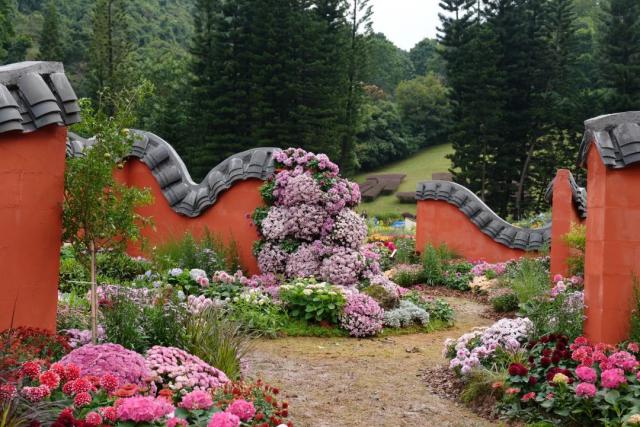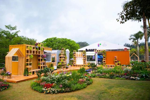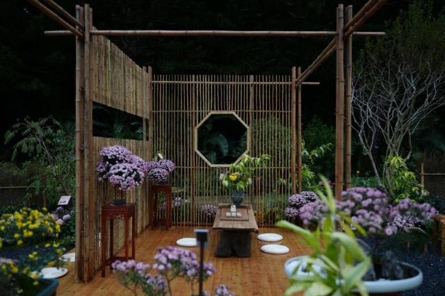 “瓦上生花”展区整体布局采用四水归堂的古典方式,传统瓷砖屋顶错落有致,营造出曲折的立体结构。以大丽花、黑心菊、万寿菊等现代菊花为辅,构建主花境,用传统当地菊花装饰瓷砖,将古典优雅与现代创意完美结合,交织出传统与现代和谐相处的画面。