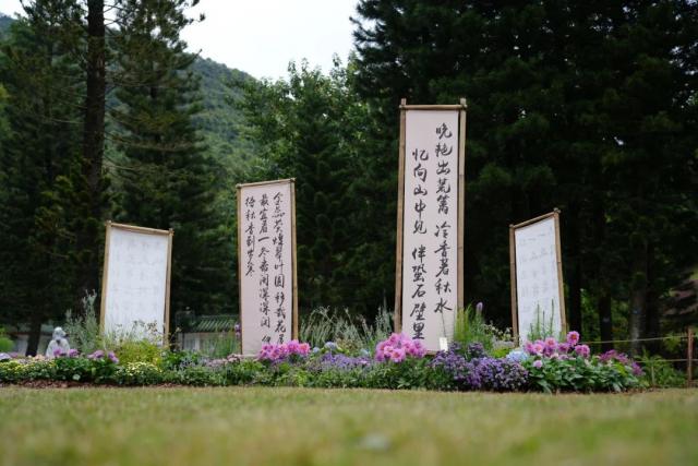 “菊书诗意”设计以传统旗帜文化为灵感,以缠绕枝纹花境为基础,部分设置书联设备,展示古今诗词文化中菊科植物的颂歌。天空中草原的整体布局以绿色和白色为主,结合了橙色、橙色、黄色和紫色的配色变化,同时在中心区域创造了菊科综合花境。