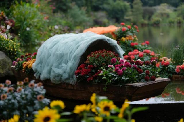 湖岸悬崖菊花和花园菊花结合景观石和枯木设备制作的瀑布景观,流水潺潺,花影摇曳,叠水与瀑布相得益彰,衬托出美丽的水面。篷船变成了一艘花船,载着各种菊花漂浮在景观中,盛开的花船和瀑布的倒影在水中相辅相成。