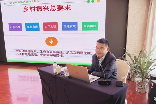 活动邀请自治区党委讲师团特聘教授、广西农业农村厅科技处处长孙庆磊进行专题讲座。他结合具体案例,分析讲解了我区农村产业存在的农村振兴工作总体要求、主要问题、推动农村产业高质量发展。