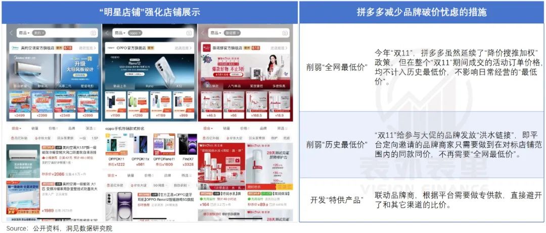 除了上面提到的流量倾斜,拼多多还细化了品牌商家的运营,比如把“明星店”放在搜索结果上,为品牌提供展示和营销的窗口;在维护品牌价格体系方面,今年双十一不再强调“全网最低价”和“历史最低价”。
