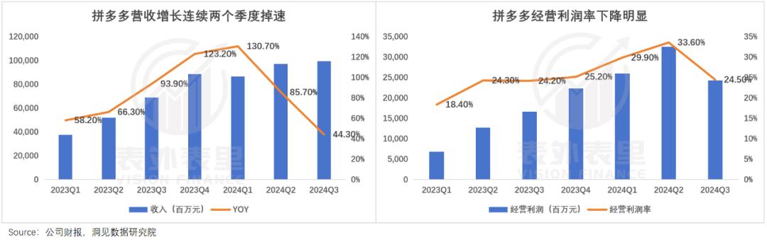 不难理解,2024Q3拼多多的收入规模不如预期,增速也从年初的130%高点下降到44%。;利润率大幅下降,营业利润率环比下降近10%。